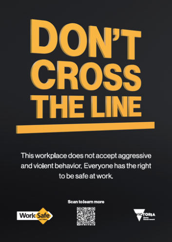 WorkSafe reminds the Victorian community to consider the impact that verbal abuse, such as yelling or swearing, may have on the many workers who face this hazard in their everyday work lives. Highlighting the impact of occupational violence and aggression is the focus of the Don’t Cross the Line campaign to be rolled out across television, radio, print and social media.