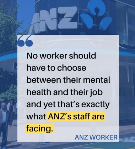 “No worker should have to choose between their mental health and their job and yet that’s exactly what ANZ’s staff are facing,” a second worker said.